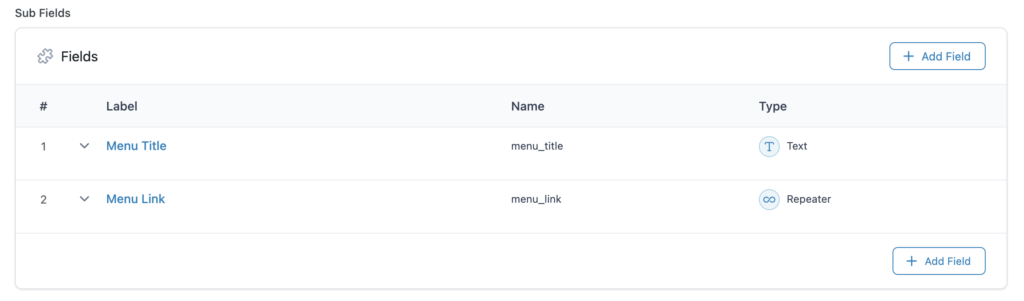 1. Create a repeater field in ACF, and Links field (Menu title will be optional)