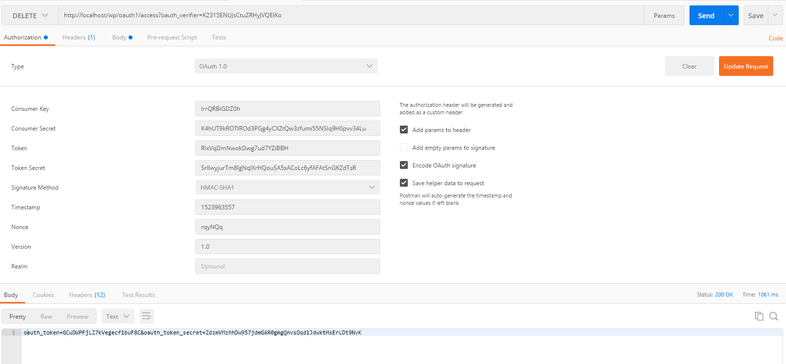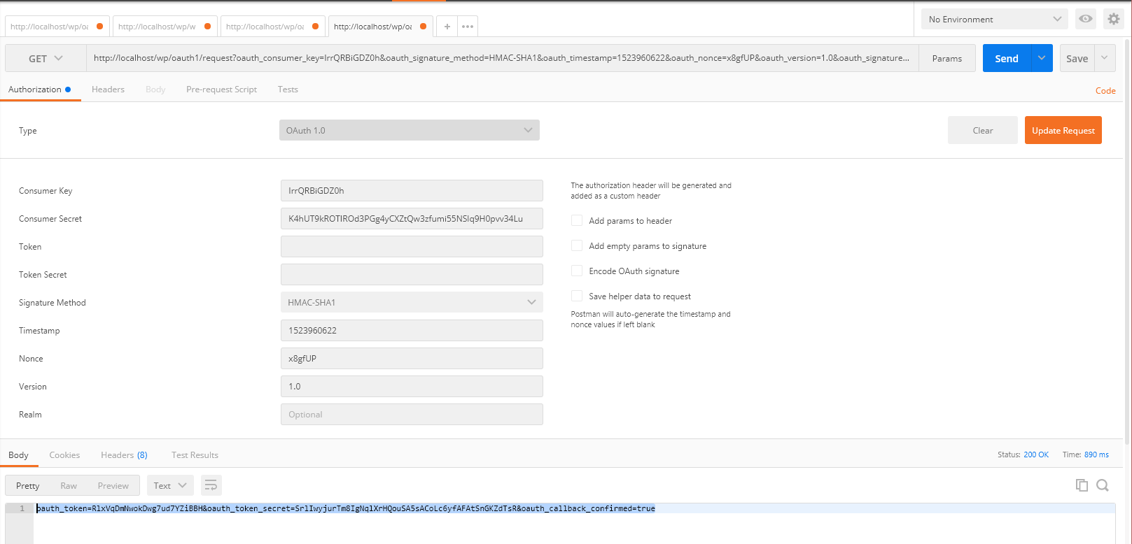 Now goto Postman and enter your request url with client id and client token e.g http://localhost/wp/oauth1/request. Click on “Update Request” and click on send button